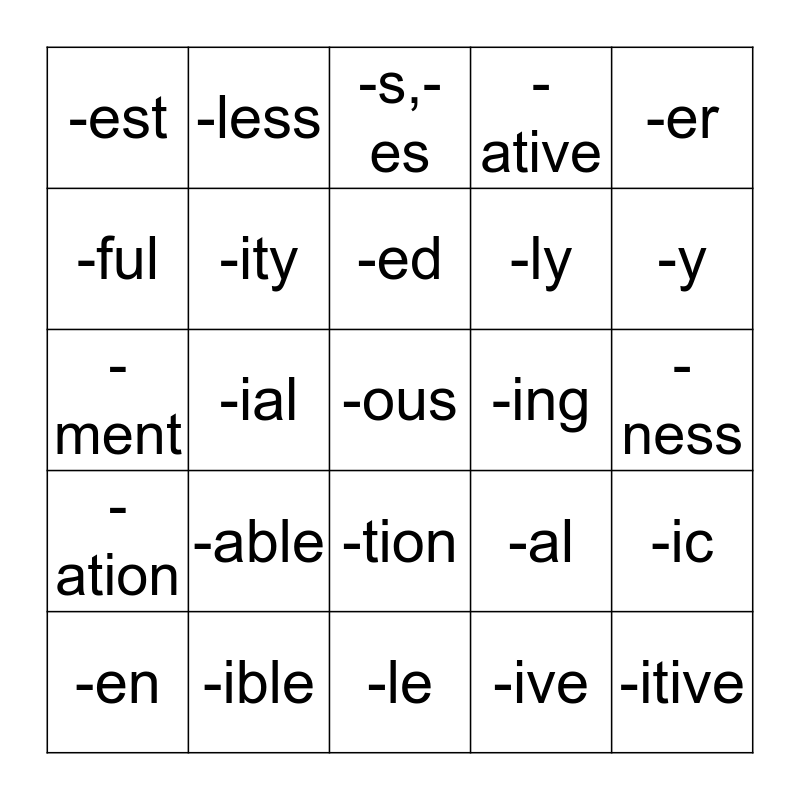 This bingo card has a free space and 24 words: -able, -ible, -ed, -en, -er, -est, -ful, -less, -ing, -tion, -ly, -ment, -al, -ic, -ity, -ive, -ness, -s,-es, -y, -ial, -itive, -ation, -ative and -le.