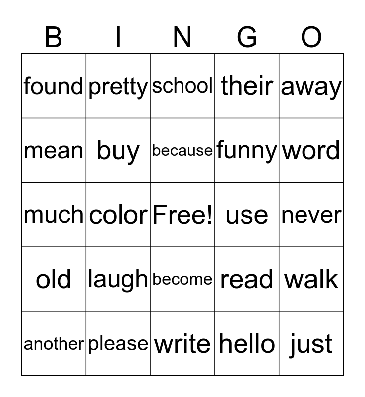 This bingo card has a free space and 24 words: laugh, please, because, another, away, found, mean, pretty, use, become, funny, much, read, walk, buy, hello, never, school, word, color, just, old, their and write.