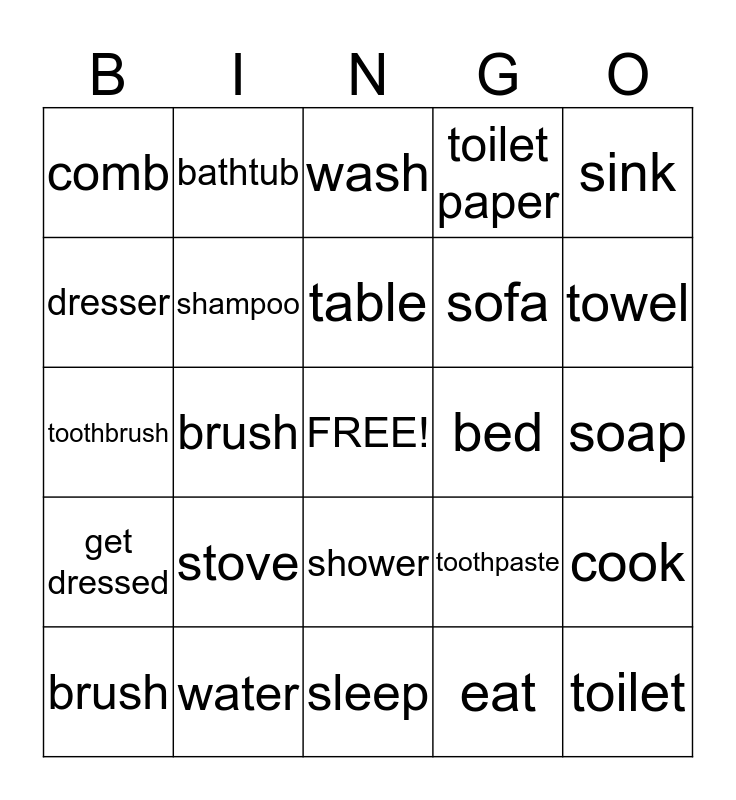 This bingo card has a free space and 24 words: stove, water, table, brush, sink, comb, dresser, bathtub, bed, shower, sofa, toothbrush, toothpaste, cook, shampoo, eat, soap, wash, towel, brush, toilet, get dressed, toilet paper and sleep.