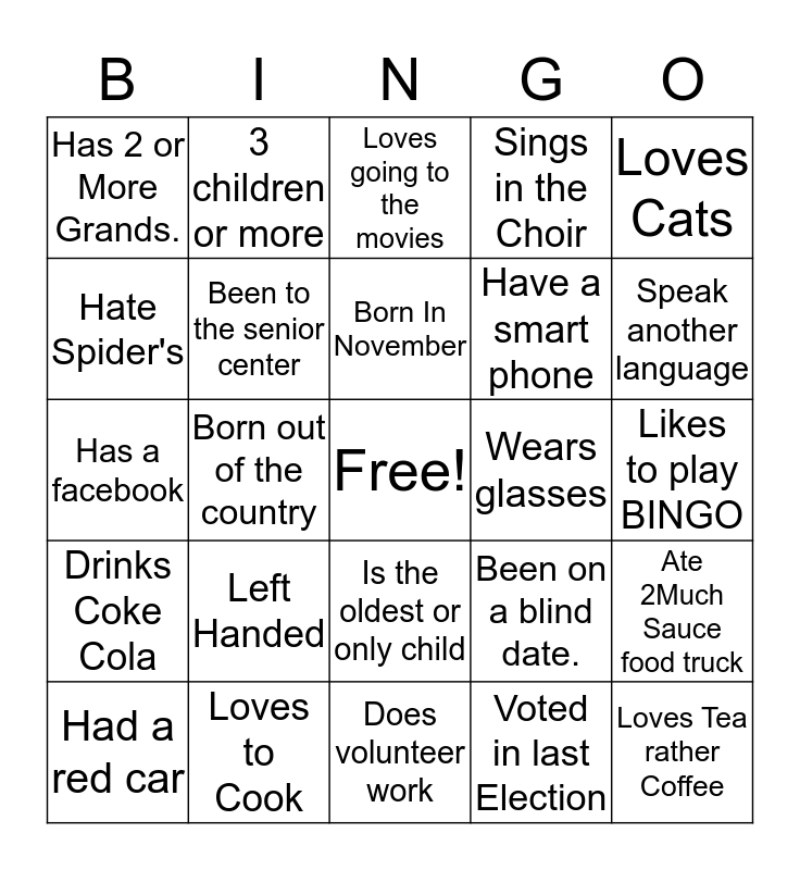 This bingo card has a free space and 24 words: Left Handed, Loves to Cook, Born In November, Had a red car, Loves Cats, Has 2 or More Grands., Hate Spider's, 3 children or more, Wears glasses, Is the oldest or only child, Have a smart phone, Has a facebook, Been on a blind date., Ate 2Much Sauce food truck, Been to the senior center, Voted in last Election, Likes to play BINGO, Loves going to the movies, Speak another language, Born out of the country, Loves Tea rather Coffee, Drinks Coke Cola, Sings in the Choir and Does volunteer work.