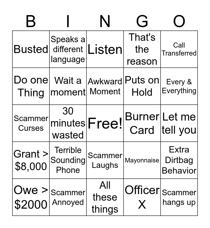 This bingo card has a free space and 24 words: Terrible Sounding Phone, Scammer Annoyed, Awkward Moment, Owe > $2000, Call Transferred, Busted, Do one Thing, Speaks a different language, Burner Card, Scammer Laughs, Puts on Hold, Scammer Curses, Mayonnaise, Extra Dirtbag Behavior, Wait a moment, Officer X, Let me tell you, Listen, Every & Everything, 30 minutes wasted, Scammer hangs up, Grant > $8,000, That's the reason and All these things.