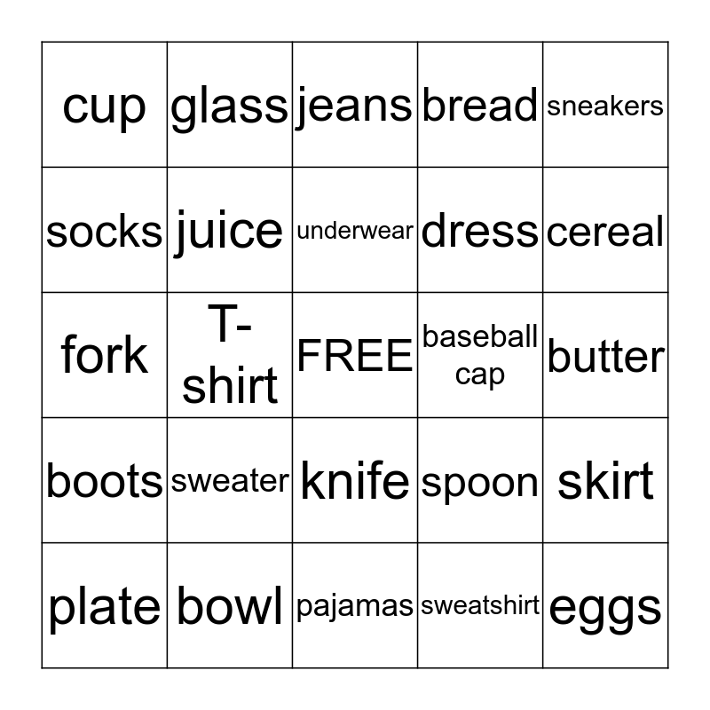 This bingo card has a free space and 24 words: sweater, bowl, underwear, plate, sneakers, cup, socks, glass, baseball cap, knife, dress, fork, spoon, skirt, juice, sweatshirt, butter, jeans, cereal, T-shirt, eggs, boots, bread and pajamas.