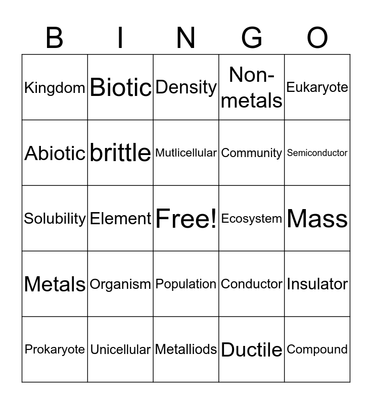 This bingo card has a free space and 24 words: Organism, Unicellular, Mutlicellular, Prokaryote, Eukaryote, Kingdom, Abiotic, Biotic, Ecosystem, Population, Community, Solubility, Conductor, Insulator, brittle, Ductile, Mass, Density, Semiconductor, Element, Compound, Metals, Non-metals and Metalliods.