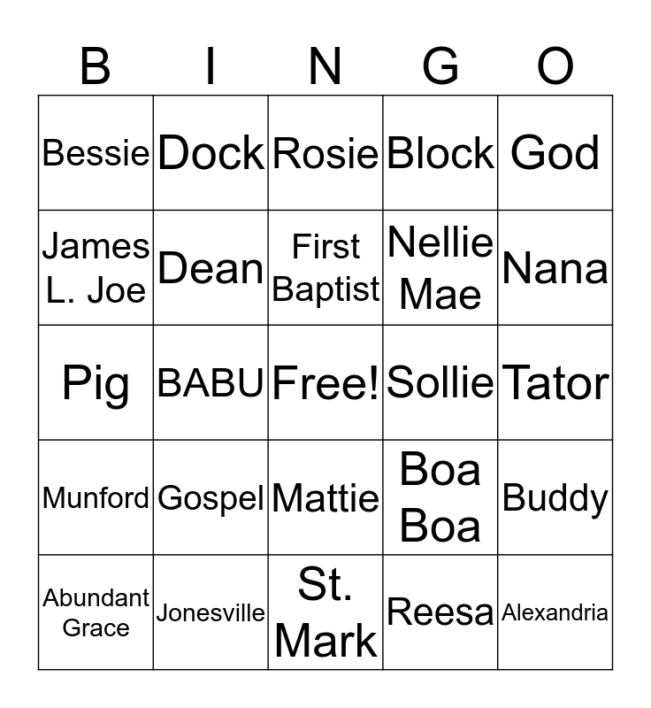 This bingo card has a free space and 25 words: Gospel, St. Mark, First Baptist, Abundant Grace, God, Bessie, James L. Joe, Dock, Sollie, Mattie, Nellie Mae, Pig, Boa Boa, Buddy, Dean, Buck, Tator, Rosie, Nana, BABU, Alexandria, Jonesville, Munford, Block and Reesa.