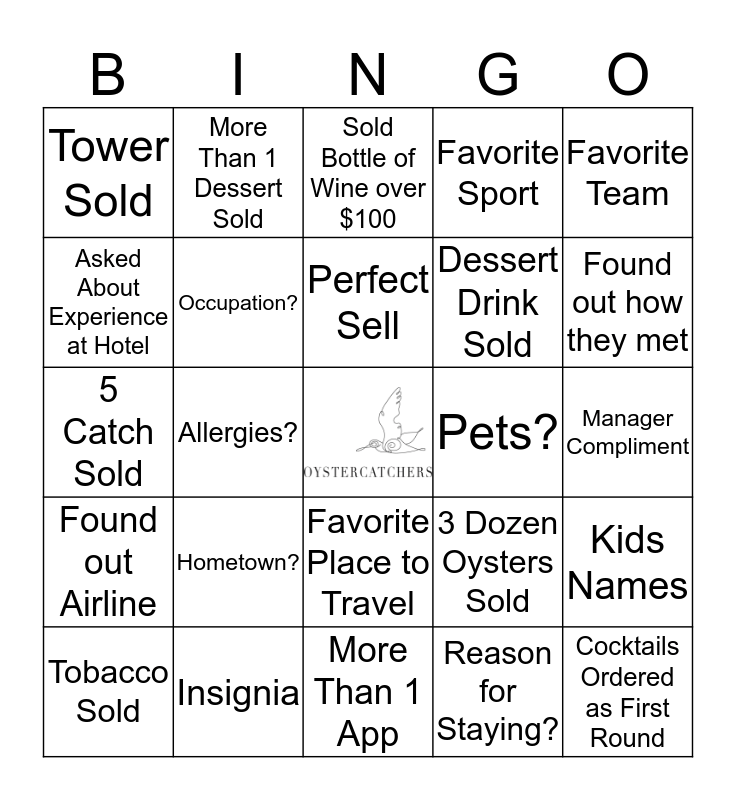 This bingo card has a free space and 24 words: Hometown?, Insignia, Perfect Sell, Tobacco Sold, Favorite Team, Tower Sold, Asked About Experience at Hotel, More Than 1 Dessert Sold, Pets?, Favorite Place to Travel, Dessert Drink Sold, 5 Catch Sold, 3 Dozen Oysters Sold, Kids Names, Occupation?, Reason for Staying?, Manager Compliment, Sold Bottle of Wine over $100, Found out how they met, Allergies?, Cocktails Ordered as First Round, Found out Airline, Favorite Sport and More Than 1 App.
