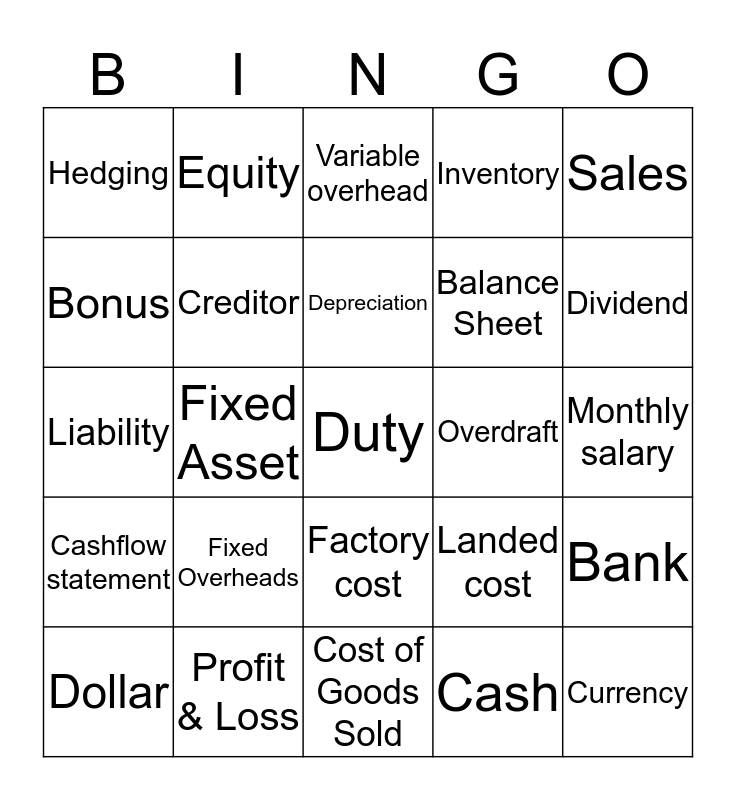 This bingo card has 30 words: Profit & Loss, Debtors, Fixed Asset, Mould, Hedging, Variable overhead, Creditor, Factory cost, Overdraft, Cost of Goods Sold, Monthly salary, Duty, Cash, Currency, Dividend, Gross Margin, Landed cost, Cashflow statement, Fixed Overheads, Sales, Liability, Excess materials, Equity, Balance Sheet, Bonus, Inventory, Bank, Dollar, Depreciation and Marketing.