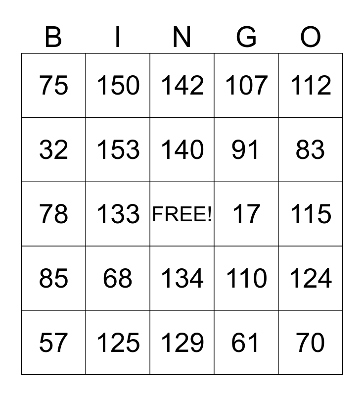 This bingo card has a free space and 24 words: 68, 125, 140, 57, 112, 75, 32, 150, 17, 134, 91, 78, 110, 124, 153, 61, 115, 142, 83, 133, 70, 85, 107 and 129.