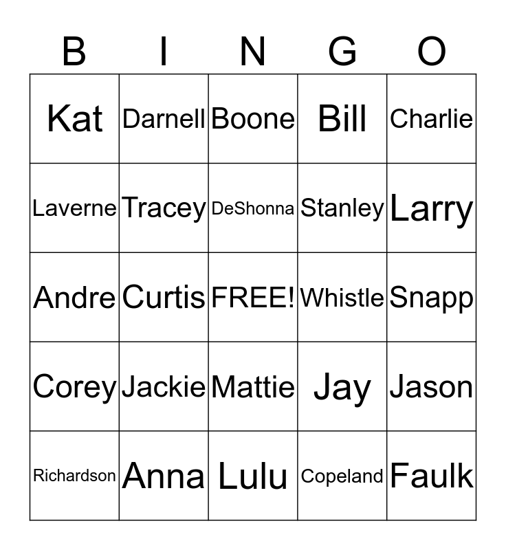 This bingo card has a free space and 44 words: Holland, Faulk, Rountree, Richardson, Baker, Copeland, Boone, Luther, Charlie, Anna, Bill, Whistle, Mattie, Jackie, Talma, Lulu, Poo Poo, Andre, Mary, Larry, Darnell, Foot, Fleetwood, Kat, James, Snapp, Jeff, Bebe, Jay, Corey, Melvin Jr, Jason, Tiffany, Tip, Curtis, Boodie, Roz, Deidra, DeShonna, Laverne, Stanley, Tommy, Tracey and Reginald.