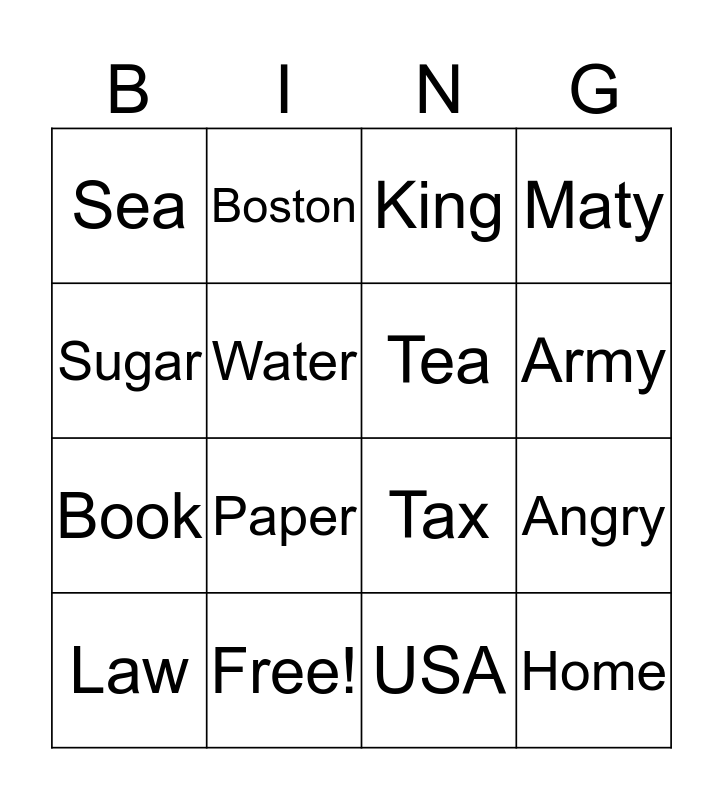 This bingo card has 22 words: Free!, Ben, Boston, Snow, Water, Tea, Sea, King, Tax, Home, Book, Maty, City, England, USA, Nice, Angry, Law, Paper, Sugar, Army and Act.