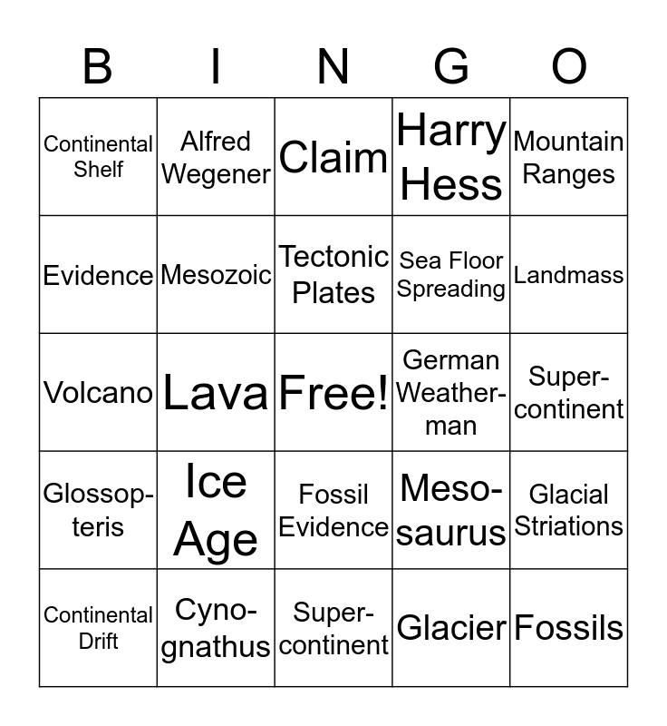 This bingo card has a free space and 24 words: Ice Age, Cyno-gnathus, Tectonic Plates, Continental Drift, Mountain Ranges, Continental Shelf, Evidence, Alfred Wegener, German Weather-man, Fossil Evidence, Sea Floor Spreading, Volcano, Meso-saurus, Glacial Striations, Mesozoic, Glacier, Super-continent, Claim, Landmass, Lava, Fossils, Glossop- teris, Harry Hess and Super-continent.