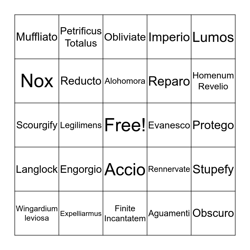 This bingo card has a free space and 26 words: Accio, Aguamenti, Alohomora, Expelliarmus, Lumos, Muffliato, Nox, Petrificus Totalus, Protego, Rennervate, Reparo, Scourgify, Stupefy, Wingardium leviosa, Legilimens, Locomotor, Imperio, Langlock, Obliviate, Obscuro, Homenum Revelio, Finite Incantatem, Evanesco, Engorgio, Reducto and Confundo.