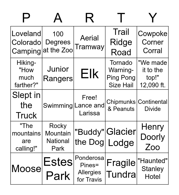 This bingo card has a free space and 24 words: Rocky Mountain National Park, Estes Park, Elk, Moose, Cowpoke Corner Corral, Loveland Colorado Camping, Hiking- "How much farther?", 100 Degrees at the Zoo, Chipmunks & Peanuts, "Buddy" the Dog, Tornado Warning- Ping Pong Size Hail, Slept in the Truck, Glacier Lodge, Henry Doorly Zoo, Junior Rangers, Fragile Tundra, Continental Divide, Aerial Tramway, "We made it to the top!" 12,090 ft., Swimming, "Haunted" Stanley Hotel, "The mountains are calling!", Trail Ridge Road and Ponderosa Pines= Allergies for Travis.