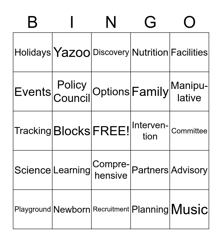 This bingo card has a free space and 24 words: Learning, Newborn, Options, Playground, Facilities, Holidays, Events, Yazoo, Interven- tion, Compre- hensive, Family, Tracking, Partners, Advisory, Policy Council, Planning, Committee, Discovery, Manipu- lative, Blocks, Music, Science, Nutrition and Recruitment.