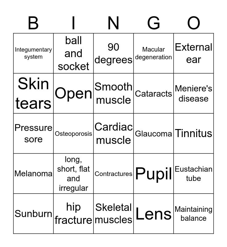 This bingo card has a free space and 30 words: Epidermis, Skeletal system, 90 degrees, Lens, External ear, Integumentary system, Open, Smooth muscle, Cataracts, Eustachian tube, Sunburn, hip fracture, Pupil, Maintaining balance, Melanoma, arthroplasty, Skeletal muscles, Glaucoma, Tinnitus, Skin tears, long, short, flat and irregular, Foot drop, Macular degeneration, Meniere's disease, Pressure sore, ball and socket, Contractures, Herpes Zoster, Osteoporosis and Atrophy.