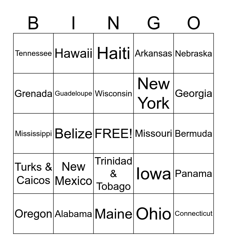 This bingo card has a free space and 61 words: Virgin Islands, Alabama, Alaska, Turks & Caicos, Ohio, Arizona, Guadeloupe, Virginia, New York, Guatemala, Arkansas, California, Grenada, Colorado, Mexico, Tennessee, Connecticut, Nebraska, Belize, Wisconsin, Missouri, Haiti, Oregon, Panama, Delaware, Bahamas, North Carolina, Florida, Georgia, New Jersey, El Salvador, Montana, Oklahoma, St. Lucia, Hawaii, Nevada, Idaho, Belize, Illinois, Mississippi, Nicaragua, New Mexico, Bermuda, Indiana, Iowa, Honduras, Kansas, Kentucky, Louisiana, Trinidad & Tobago, Maine, Maryland, Barbados, New Hampshire, Massachusetts, Michigan, Canada, Texas, Minnesota, Washington and Puerto Rico.