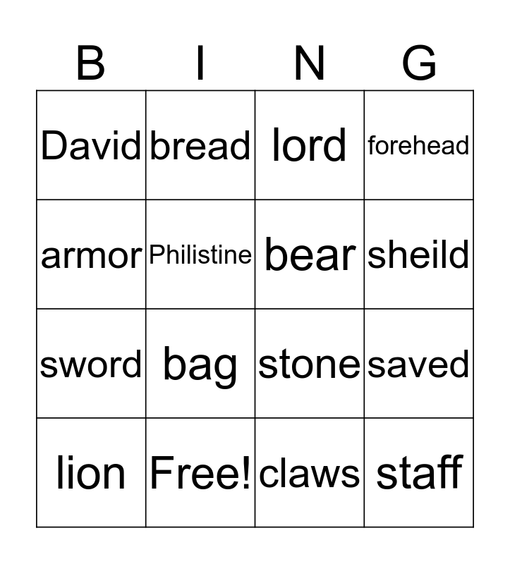 This bingo card has 24 words: Goliath, Israelite, sheild, spear, armor, David, Philistine, bread, Free!, dagger, sword, stone, Saul, river, bear, sling, claws, lord, bag, saved, lion, staff, forehead and helmet.