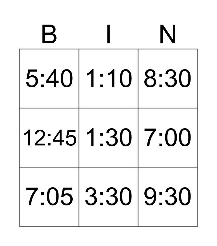 This bingo card has a free space and 8 words: 7:00, 8:30, 1:10, 7:05, 5:40, 9:30, 12:45 and 3:30.