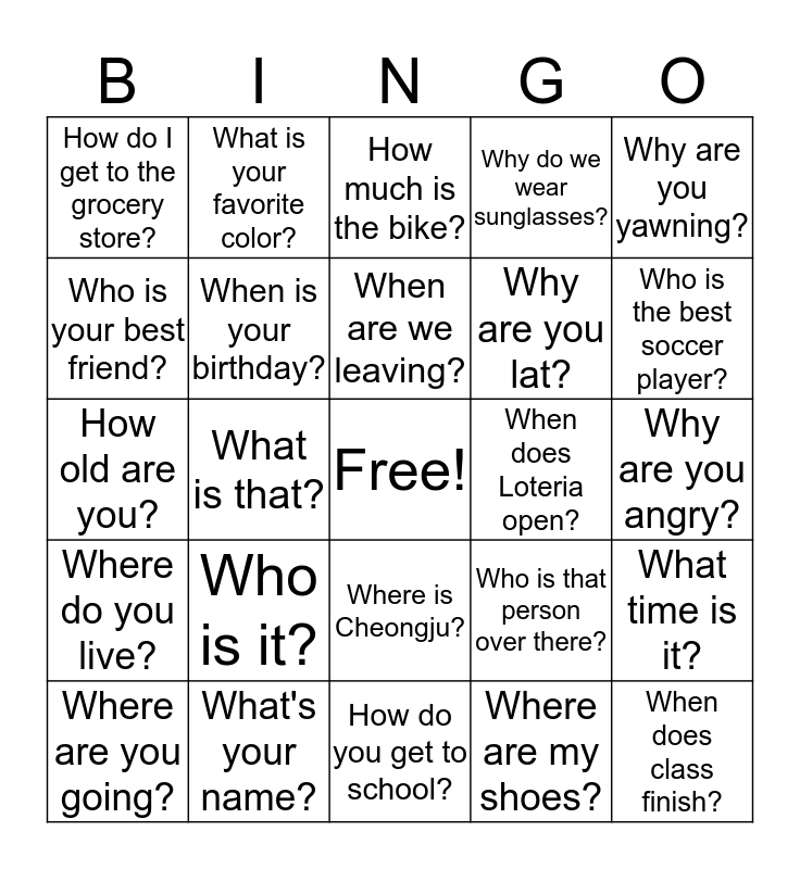 This bingo card has a free space and 24 words: Who is it?, What's your name?, When are we leaving?, Where are you going?, Why are you yawning?, How do I get to the grocery store?, Who is your best friend?, What is your favorite color?, When does Loteria open?, Where is Cheongju?, Why are you lat?, How old are you?, Who is that person over there?, What time is it?, When is your birthday?, Where are my shoes?, Why are you angry?, How much is the bike?, Who is the best soccer player?, What is that?, When does class finish?, Where do you live?, Why do we wear sunglasses? and How do you get to school?.
