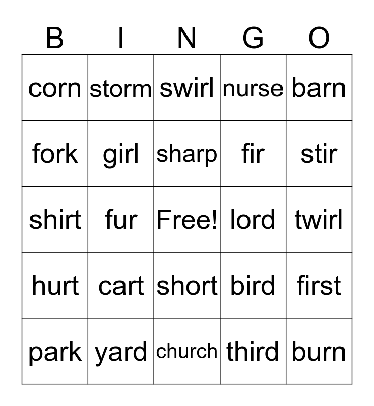 This bingo card has a free space and 24 words: cart, yard, sharp, park, barn, corn, fork, storm, lord, short, fir, shirt, bird, first, girl, third, twirl, swirl, stir, fur, burn, hurt, nurse and church.