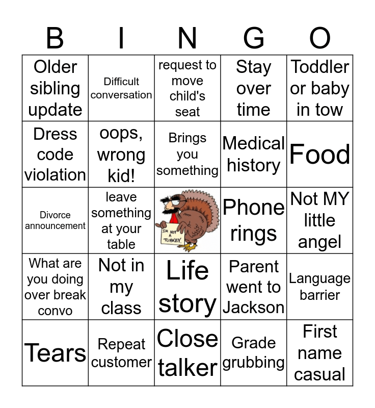 This bingo card has a free space and 24 words: Not in my class, Repeat customer, Brings you something, Tears, Toddler or baby in tow, Older sibling update, Dress code violation, Difficult conversation, Phone rings, Life story, Medical history, Divorce announcement, Parent went to Jackson, Language barrier, oops, wrong kid!, Grade grubbing, Not MY little angel, request to move child's seat, Food, leave something at your table, First name casual, What are you doing over break convo, Stay over time and Close talker.