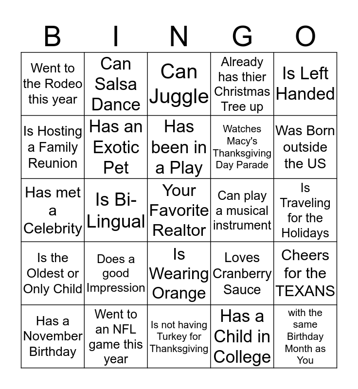 This bingo card has a free space and 24 words: Does a good Impression, Went to an NFL game this year, Has been in a Play, Has a November Birthday, Is Left Handed, Went to the Rodeo this year, Is Hosting a Family Reunion, Can Salsa Dance, Can play a musical instrument, Is Wearing Orange, Watches Macy's Thanksgiving Day Parade, Has met a Celebrity, Loves Cranberry Sauce, Cheers for the TEXANS, Has an Exotic Pet, Has a Child in College, Is Traveling for the Holidays, Can Juggle, Was Born outside the US, Is Bi-Lingual, with the same Birthday Month as You, Is the Oldest or Only Child, Already has thier Christmas Tree up and Is not having Turkey for Thanksgiving.