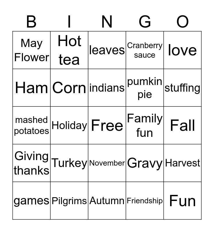 This bingo card has a free space and 24 words: Turkey, Pilgrims, indians, games, love, May Flower, Ham, Hot tea, Family fun, November, pumkin pie, mashed potatoes, Gravy, Harvest, Corn, Friendship, Fall, leaves, stuffing, Holiday, Fun, Giving thanks, Cranberry sauce and Autumn.