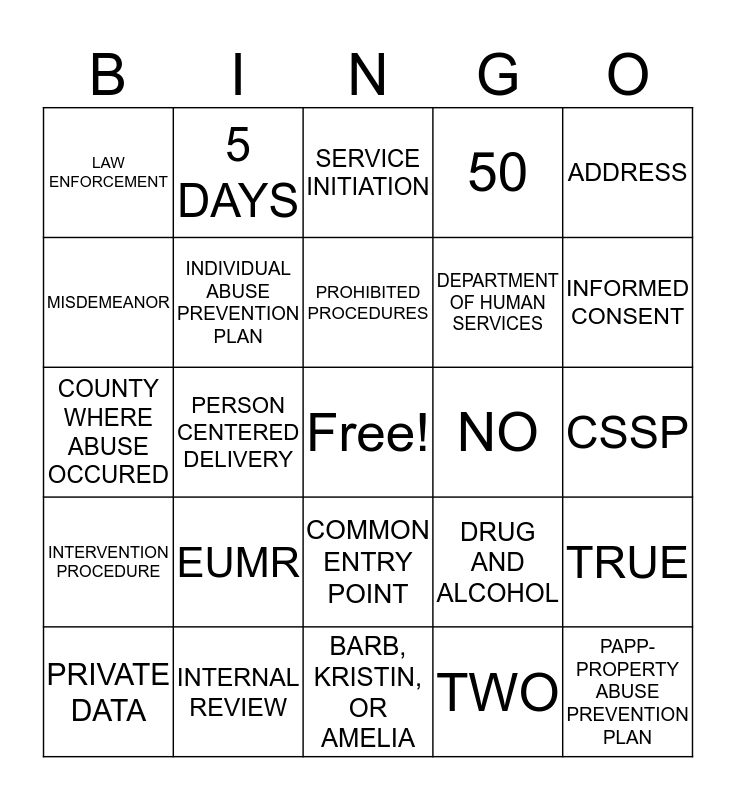 This bingo card has a free space and 33 words: EUMR, YES, PERSON CENTERED DELIVERY, TRUE, INTERVENTION PROCEDURE, INDIVIDUAL ABUSE PREVENTION PLAN, ADDRESS, PRIVATE DATA, 5 DAYS, RIGHT, PROHIBITED PROCEDURES, SERVICE INITIATION, CONFIDENTIALITY AND DATA PRIVACY, SELF DETERMINATION, NO, INFORMED CONSENT, INTERNAL REVIEW, COUNTY WHERE ABUSE OCCURED, EUMR, DRUG AND ALCOHOL, COMMON ENTRY POINT, RIGHTS RESTRICTION, LAW ENFORCEMENT, CSSP, BARB, KRISTIN, OR AMELIA, PAPP-PROPERTY ABUSE PREVENTION PLAN, 50, DEPARTMENT OF HUMAN SERVICES, MISDEMEANOR, TRUE, TWO, TWO and INCLUSION, PARTICIPATION IN THE COMMUNITY, A BALANCE BETWEEN RISK AND OPPORTUNITY.