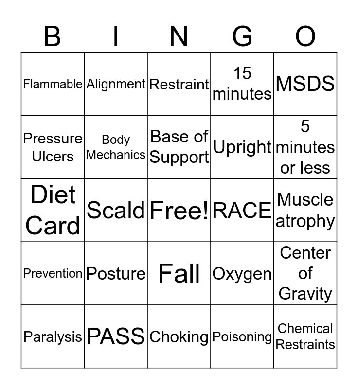 This bingo card has a free space and 29 words: Paralysis, Fracture, Scald, Abrasion, Flammable, Restraint, Body Mechanics, Posture, RACE, PASS, Muscle atrophy, Chemical Restraints, Choking, Poisoning, 5 minutes or less, Walking Aids, Fall, Prevention, MSDS, Diet Card, Oxygen, Identify, Upright, Pressure Ulcers, 15 minutes, Alignment, Center of Gravity, Base of Support and Stop, Drop and Roll.