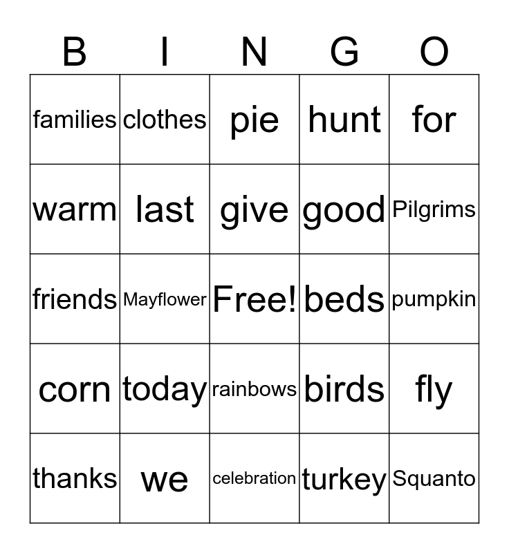 This bingo card has a free space and 24 words: today, we, give, thanks, for, families, warm, clothes, beds, rainbows, good, friends, birds, fly, last, turkey, pumpkin, pie, Pilgrims, Mayflower, Squanto, corn, hunt and celebration.
