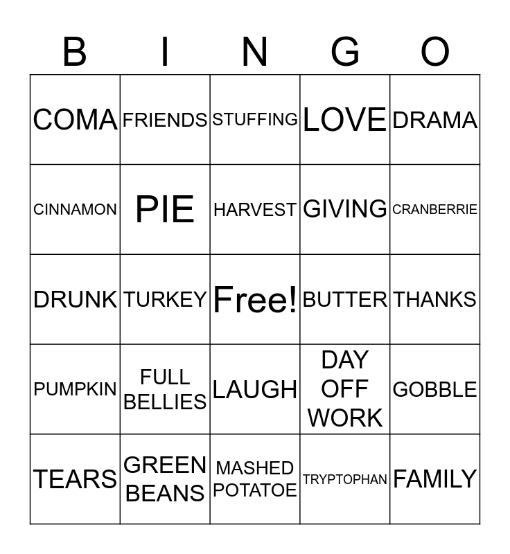 This bingo card has a free space and 29 words: TEARS, WINE, TURKEY, GRAVY, COMA, STUFFING, PIE, FULL BELLIES, BUTTER, GREEN BEANS, THANKS, FAMILY, MASHED POTATOE, TRYPTOPHAN, CRANBERRIE, ROLLS, LAUGH, PUMPKIN, DRAMA, DRUNK, DAY OFF WORK, KIDS TABLE, GIVING, CINNAMON, LOVE, FRIENDS, GOBBLE, HARVEST and HOME.