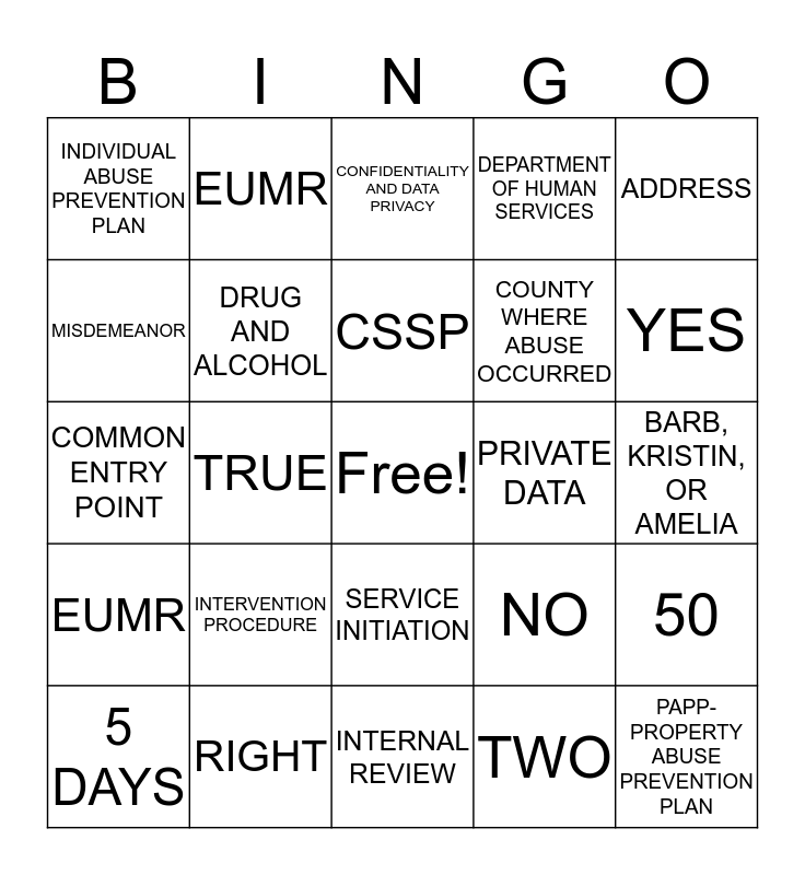 This bingo card has a free space and 33 words: PROHIBITED PROCEDURES, SELF DETERMINATION, TRUE, PERSON CENTERED DELIVERY, EUMR, DRUG AND ALCOHOL, ADDRESS, 5 DAYS, EUMR, INCLUSION, PARTICIPATION IN THE COMMUNITY, A BALANCE BETWEEN RISK AND OPPORTUNITY, CSSP, CONFIDENTIALITY AND DATA PRIVACY, LAW ENFORCEMENT, RIGHTS RESTRICTION, PRIVATE DATA, YES, RIGHT, COMMON ENTRY POINT, INTERVENTION PROCEDURE, NO, SERVICE INITIATION, INFORMED CONCENT, INDIVIDUAL ABUSE PREVENTION PLAN, BARB, KRISTIN, OR AMELIA, INTERNAL REVIEW, PAPP- PROPERTY ABUSE PREVENTION PLAN, DEPARTMENT OF HUMAN SERVICES, COUNTY WHERE ABUSE OCCURRED, MISDEMEANOR, 50, TRUE, TWO and TWO.