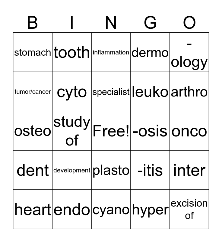 This bingo card has a free space and 56 words: cardio, heart, gastro, stomach, cyano, blue, cyto, cell, leuko, white, dermo, skin, patho, disease, -algia, pain, -ology, study of, -ectomy, excision of, -osis, condition, -itis, inflammation, -ologist, specialist, -otomy, cut into, arthro, joint, lipo, fat, chondro, cartilage, onco, tumor/cancer, osteo, bone, dent, tooth, plasto, repair, histo, tissue, troph, development, endo, inside, exo, outside, hyper, excessive, hypo, low/insufficient, inter and between.