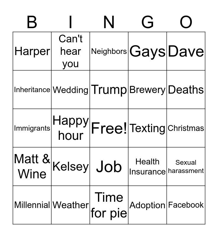 This bingo card has a free space and 24 words: Kelsey, Weather, Trump, Millennial, Dave, Harper, Inheritance, Can't hear you, Texting, Job, Brewery, Immigrants, Health Insurance, Sexual harassment, Wedding, Adoption, Christmas, Neighbors, Deaths, Happy hour, Facebook, Matt & Wine, Gays and Time for pie.
