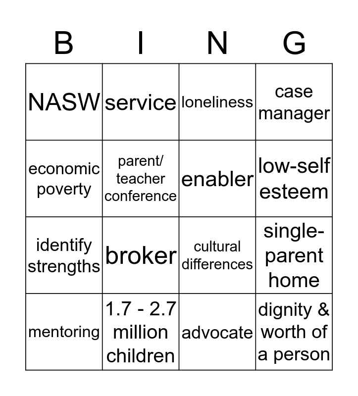 This bingo card has 16 words: 1.7 - 2.7 million children, single-parent home, loneliness, NASW, identify strengths, service, cultural differences, advocate, economic poverty, parent/ teacher conference, mentoring, case manager, broker, low-self esteem, enabler and dignity & worth of a person.