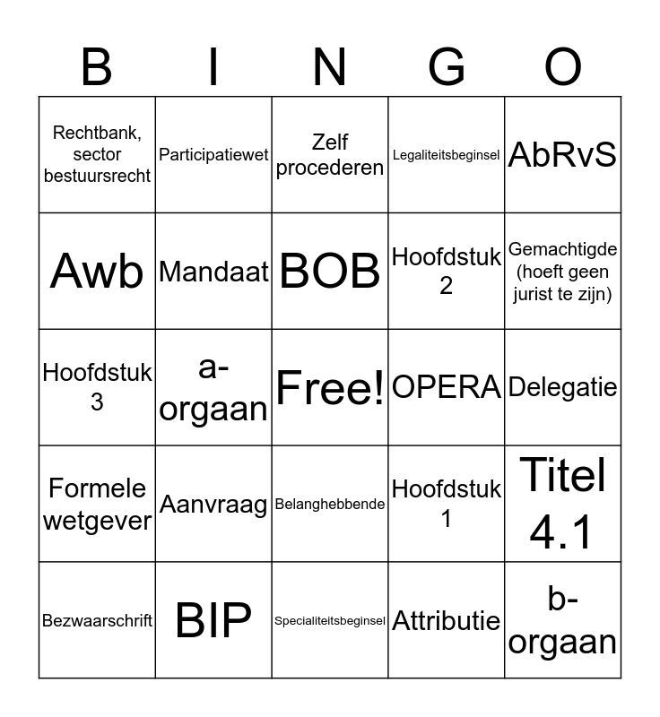 This bingo card has a free space and 24 words: Aanvraag, BIP, BOB, Bezwaarschrift, AbRvS, Rechtbank, sector bestuursrecht, Awb, Participatiewet, OPERA, Belanghebbende, Hoofdstuk 2, Hoofdstuk 3, Hoofdstuk 1, Titel 4.1, Mandaat, Attributie, Delegatie, Zelf procederen, Gemachtigde (hoeft geen jurist te zijn), a-orgaan, b-orgaan, Formele wetgever, Legaliteitsbeginsel and Specialiteitsbeginsel.