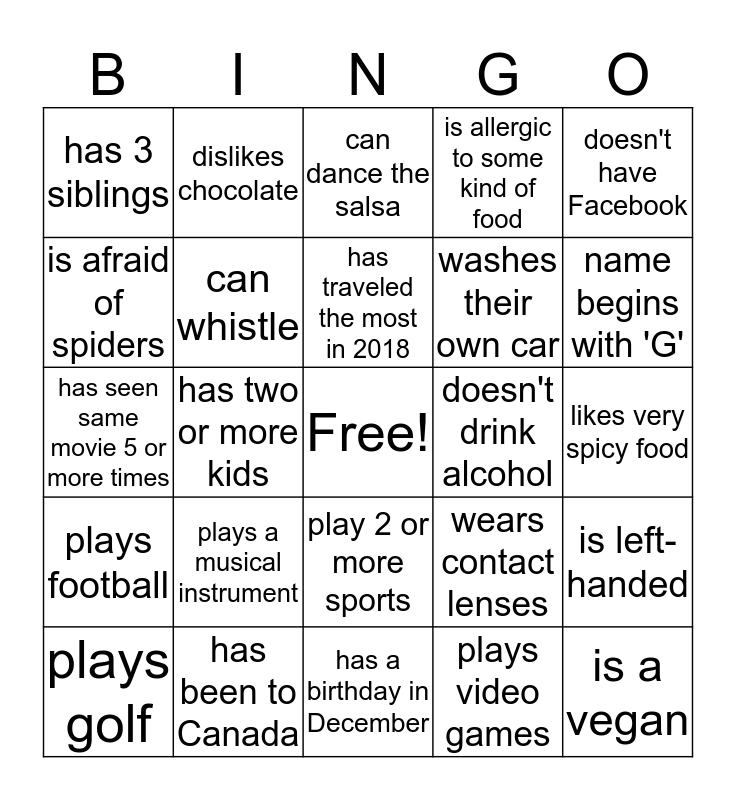This bingo card has a free space and 25 words: plays a musical instrument, has a birthday in December, has traveled the most in 2018, plays golf, doesn't have Facebook, has 3 siblings, is afraid of spiders, dislikes chocolate, doesn't drink alcohol, play 2 or more sports, washes their own car, has seen same movie 5 or more times, wears contact lenses, is left-handed, can whistle, has bungee jumped, likes very spicy food, can dance the salsa, name begins with 'G', has two or more kids, is a vegan, has been to Canada, plays football, is allergic to some kind of food and plays video games.
