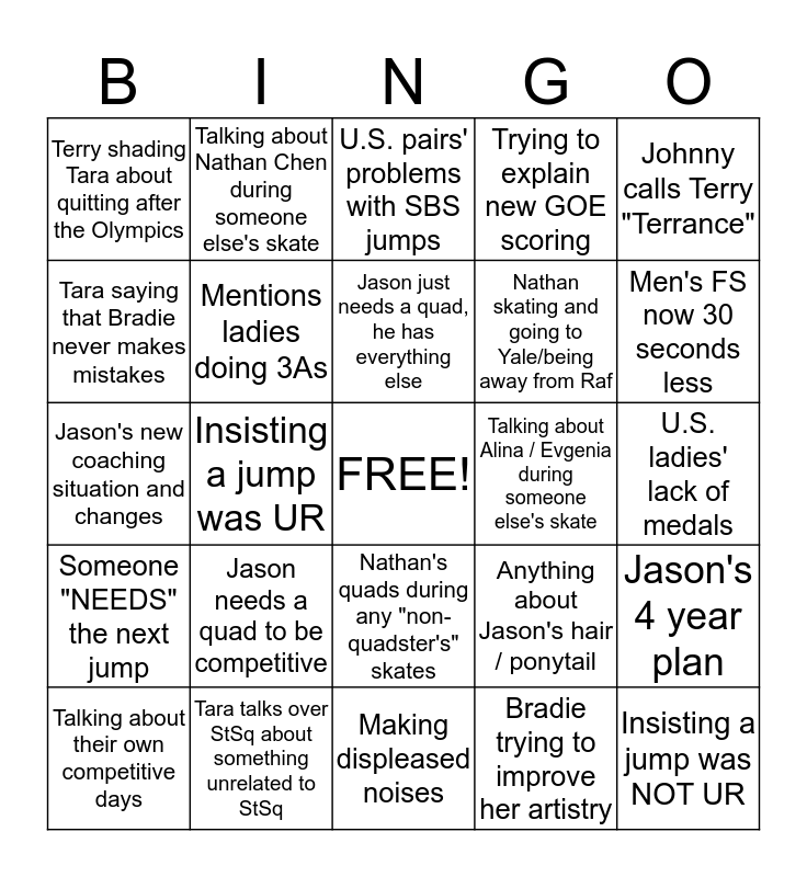 This bingo card has a free space and 24 words: Jason needs a quad to be competitive, Tara talks over StSq about something unrelated to StSq, Jason just needs a quad, he has everything else, Talking about their own competitive days, Johnny calls Terry "Terrance", Terry shading Tara about quitting after the Olympics, Tara saying that Bradie never makes mistakes, Talking about Nathan Chen during someone else's skate, Talking about Alina / Evgenia during someone else's skate, Nathan's quads during any "non-quadster's" skates, Nathan skating and going to Yale/being away from Raf, Jason's new coaching situation and changes, Anything about Jason's hair / ponytail, Jason's 4 year plan, Mentions ladies doing 3As, Bradie trying to improve her artistry, U.S. ladies' lack of medals, U.S. pairs' problems with SBS jumps, Men's FS now 30 seconds less, Insisting a jump was UR, Insisting a jump was NOT UR, Someone "NEEDS" the next jump, Trying to explain new GOE scoring and Making displeased noises.