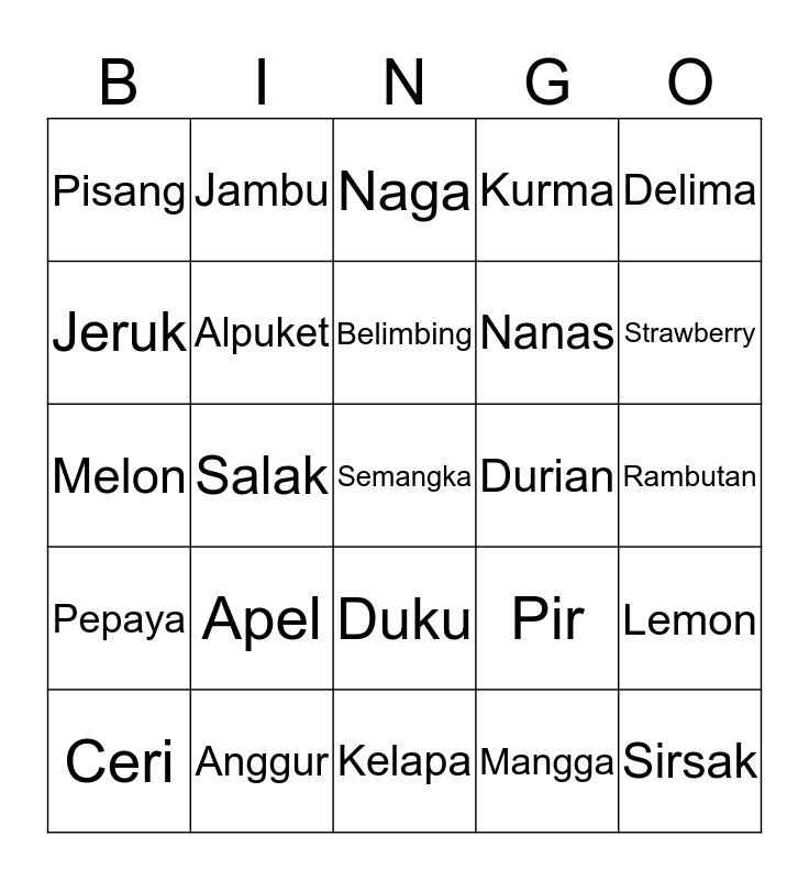 This bingo card has a free space and 24 words: Apel, Anggur, Belimbing, Ceri, Delima, Pisang, Jeruk, Jambu, Durian, Duku, Nanas, Melon, Pir, Lemon, Alpuket, Mangga, Rambutan, Naga, Strawberry, Salak, Sirsak, Pepaya, Kurma and Kelapa.
