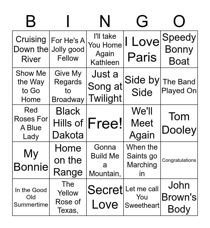 This bingo card has a free space and 41 words: Goodnight Ladies, Red Roses For A Blue Lady, Beautiful Dreamer, Give My Regards to Broadway, The Yellow Rose of Texas,, Gonna Build Me a Mountain,, Just a Song at Twilight, Amazing Graze, Speedy Bonny Boat, My Bonnie, Black Hills of Dakota, I Love Paris, John Brown's Body, Tom Dooley, We'll Meet Again, Home on the Range, I'll be Your Sweetheart, Cruising Down the River, You made me love you, I'll take You Home Again Kathleen, Congratulations, Goodnight Ladies, Secret Love, Side by Side, Bless'em All, Lilli Marlene, Let me call You Sweetheart, After the Ball, The Band Played On, Bill Bailey, Down By the Riverside, For He's A Jolly good Fellow, In the Good Old Summertime, There is a Tavern in the Town, When the Saints go Marching in, Show Me the Way to Go Home, You are my Sunshine, The Sound of Music, Swanee River, Green Sleeves and Love Me Tender.