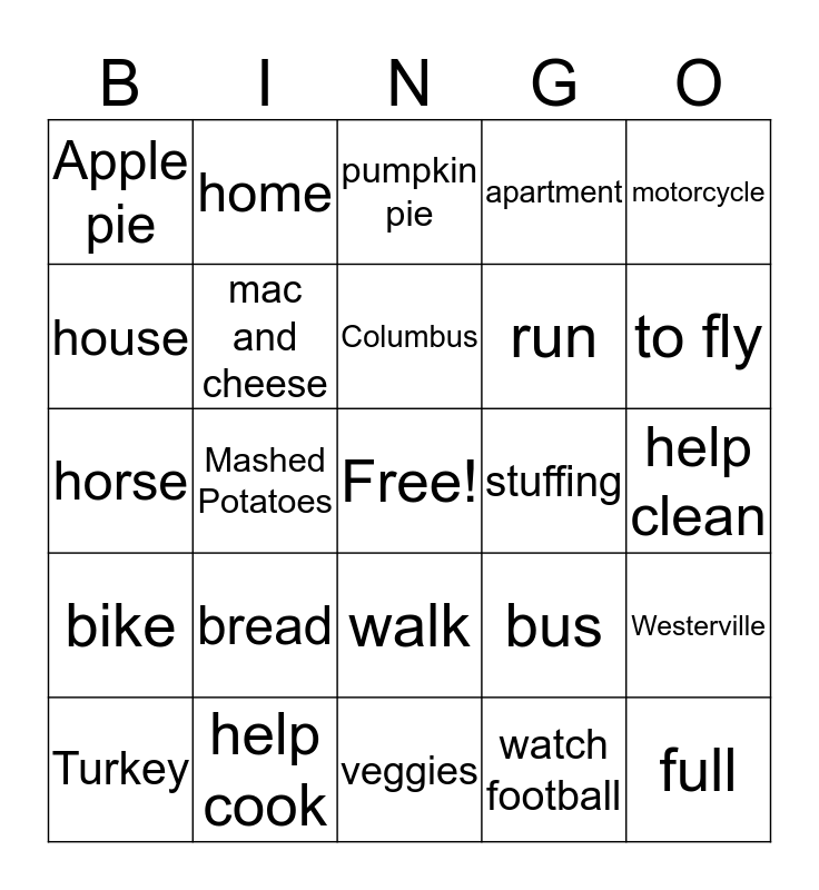 This bingo card has a free space and 29 words: Turkey, Ham, Mashed Potatoes, Sweet potatoes, Apple pie, pumpkin pie, mac and cheese, bread, stuffing, help cook, help clean, full, veggies, watch football, to fly, car, walk, bike, motorcycle, horse, bus, train, run, house, apartment, home, Westerville, Columbus and subway.