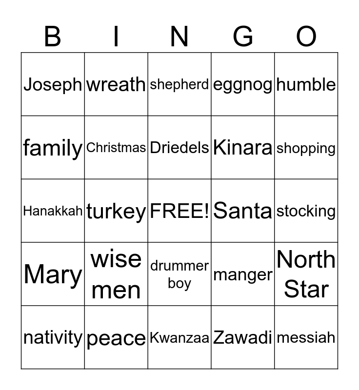 This bingo card has a free space and 35 words: angels, Bethlehem, chimney, Christmas, drummer boy, eggnog, family, frankincense, Driedels, gifts, Hanakkah, humble, Jesus, jingle bells, Joseph, Santa, Zawadi, turkey, Mary, messiah, manger, nativity, North Star, peace, shepherd, shopping, silent night, snow, Kinara, stocking, Menorah, Kwanzaa, wise men, wreath and yuletide.