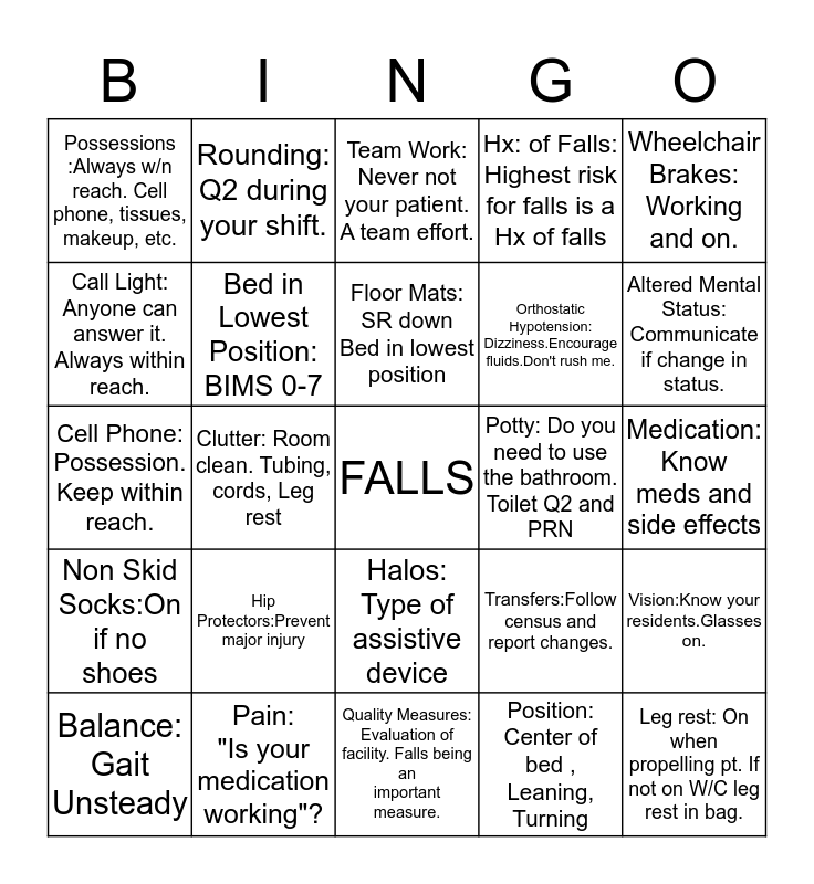 This bingo card has a free space and 24 words: Hip Protectors:Prevent major injury, Pain: "Is your medication working"?, Floor Mats: SR down Bed in lowest position, Balance: Gait Unsteady, Wheelchair Brakes: Working and on., Possessions :Always w/n reach. Cell phone, tissues, makeup, etc., Call Light: Anyone can answer it. Always within reach., Rounding: Q2 during your shift., Potty: Do you need to use the bathroom. Toilet Q2 and PRN, Halos: Type of assistive device, Orthostatic Hypotension: Dizziness.Encourage fluids.Don't rush me., Cell Phone: Possession. Keep within reach., Transfers:Follow census and report changes., Vision:Know your residents.Glasses on., Bed in Lowest Position: BIMS 0-7, Position: Center of bed , Leaning, Turning, Medication: Know meds and side effects, Team Work: Never not your patient. A team effort., Altered Mental Status: Communicate if change in status., Clutter: Room clean. Tubing, cords, Leg rest, Leg rest: On when propelling pt. If not on W/C leg rest in bag., Non Skid Socks:On if no shoes, Hx: of Falls: Highest risk for falls is a Hx of falls and Quality Measures: Evaluation of facility. Falls being an important measure..