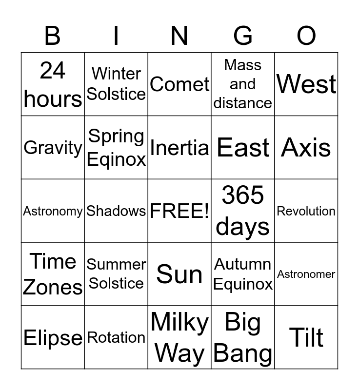 This bingo card has a free space and 24 words: Summer Solstice, Rotation, Inertia, Elipse, West, 24 hours, Gravity, Winter Solstice, 365 days, Sun, East, Astronomy, Autumn Equinox, Astronomer, Spring Eqinox, Big Bang, Revolution, Comet, Axis, Shadows, Tilt, Time Zones, Mass and distance and Milky Way.