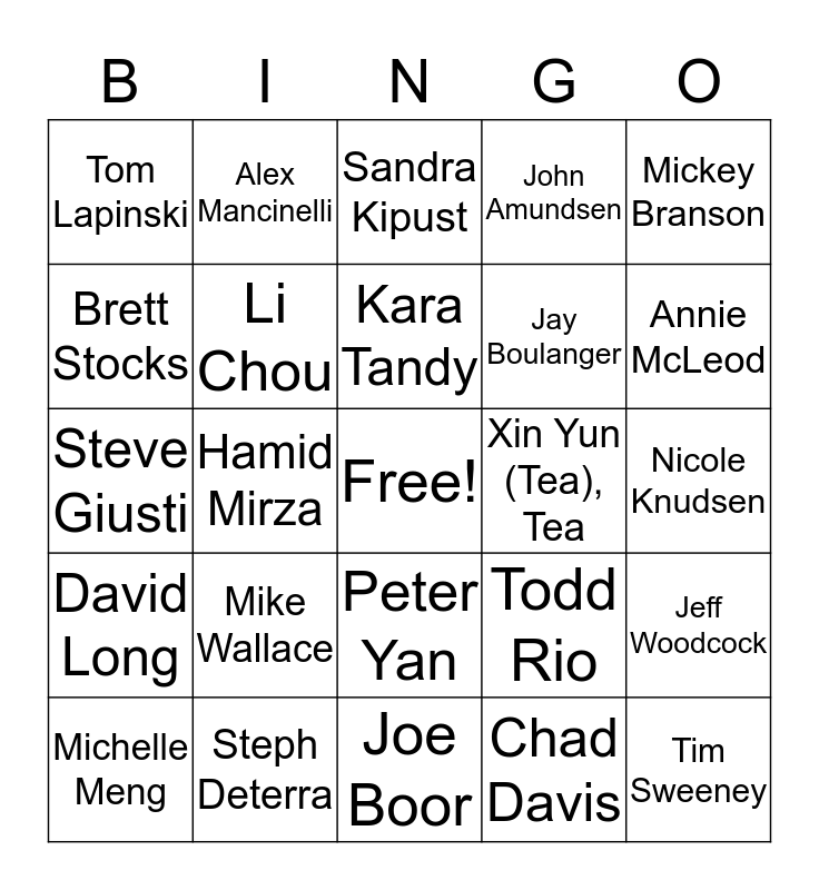 This bingo card has a free space and 24 words: Mike Wallace, Steph Deterra, Kara Tandy, Michelle Meng, Mickey Branson, Tom Lapinski, Brett Stocks, Alex Mancinelli, Xin Yun (Tea), Tea, Peter Yan, Jay Boulanger, Steve Giusti, Todd Rio, Jeff Woodcock, Li Chou, Chad Davis, Nicole Knudsen, Sandra Kipust, Annie McLeod, Hamid Mirza, Tim Sweeney, David Long, John Amundsen and Joe Boor.