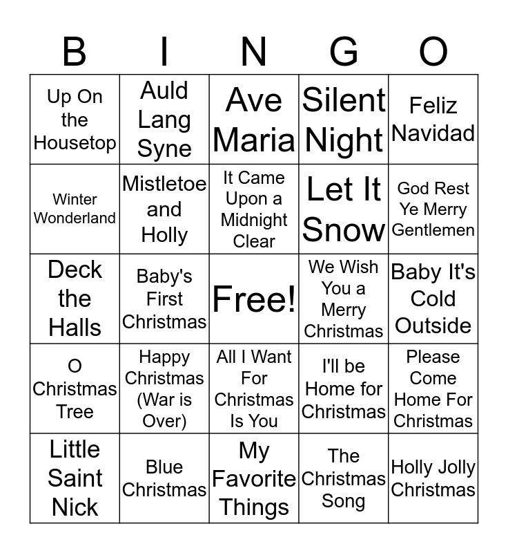 This bingo card has a free space and 53 words: Have Yourself a Merry Little Christmas, Holly Jolly Christmas, Carol of the Bells, The Christmas Song, Happy Christmas (War is Over), Home For the Holidays, Auld Lang Syne, Here Comes Santa Claus, Winter Wonderland, White Christmas, Mistletoe and Holly, Oh Come All Ye Faithful, Please Come Home For Christmas, I'll be Home for Christmas, Do You Hear What I Hear, Little Saint Nick, It Came Upon a Midnight Clear, We Wish You a Merry Christmas, O Holy Night, Feliz Navidad, Baby's First Christmas, The Twelve Days of Christmas, Let It Snow, Up On the Housetop, It's Beginning to Look a Lot Christmas, Blue Christmas, Santa Baby, It's the Most Wonderful Time of the Year, O Little Town of Bethlehem, God Rest Ye Merry Gentlemen, Rockin' Around the Christmas Tree, Rudolph The Red-Nosed Reindeer, Jingle Bells, Jingle Bell Rock, Silver Bells, Santa Claus is Comin' to Town, Silent Night, My Favorite Things, Ave Maria, Jolly Old St. Nicholas, The First Noel, Run Run Rudolph, Baby It's Cold Outside, Joy to the World, Frosty the Snowman, All I Want For Christmas Is You, The Little Drummer Boy, Away in a Manger, Deck the Halls, O Christmas Tree, Sleigh Ride, Good King Wenceslas and Here We Come a Caroling.