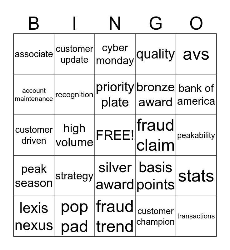 This bingo card has a free space and 24 words: strategy, pop pad, priority plate, lexis nexus, avs, associate, account maintenance, customer update, fraud claim, silver award, bronze award, customer driven, basis points, stats, recognition, customer champion, peakability, cyber monday, bank of america, high volume, transactions, peak season, quality and fraud trend.