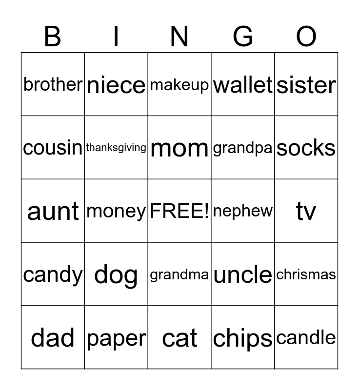 This bingo card has a free space and 25 words: dog, cat, mom, dad, sister, brother, cousin, niece, nephew, grandma, grandpa, aunt, uncle, chrismas, thanksgiving, glass, tv, makeup, socks, money, candle, paper, candy, wallet and chips.