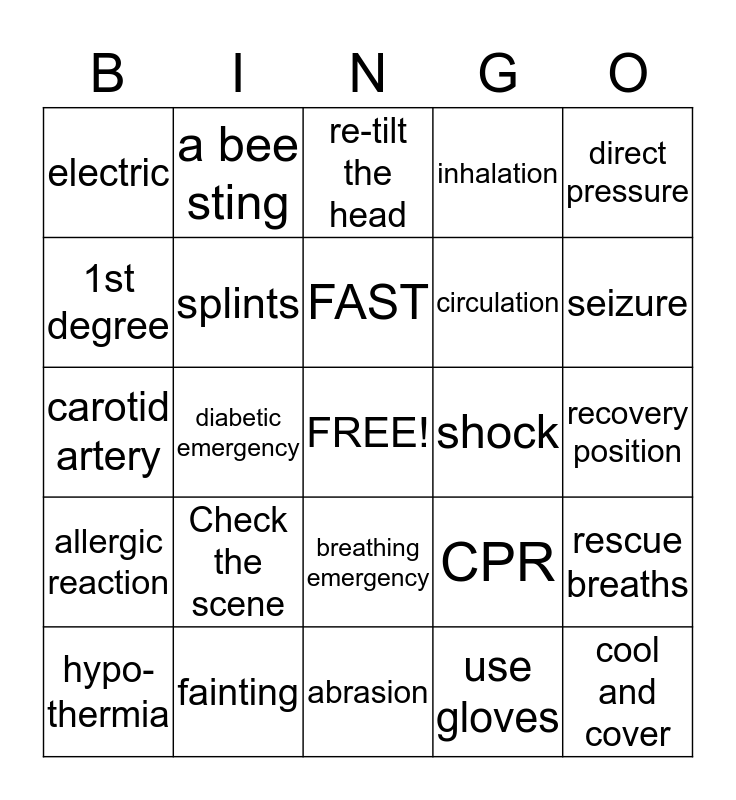 This bingo card has a free space and 24 words: Check the scene, fainting, FAST, hypo- thermia, direct pressure, electric, 1st degree, a bee sting, shock, breathing emergency, circulation, carotid artery, CPR, rescue breaths, splints, use gloves, recovery position, re-tilt the head, seizure, diabetic emergency, cool and cover, allergic reaction, inhalation and abrasion.