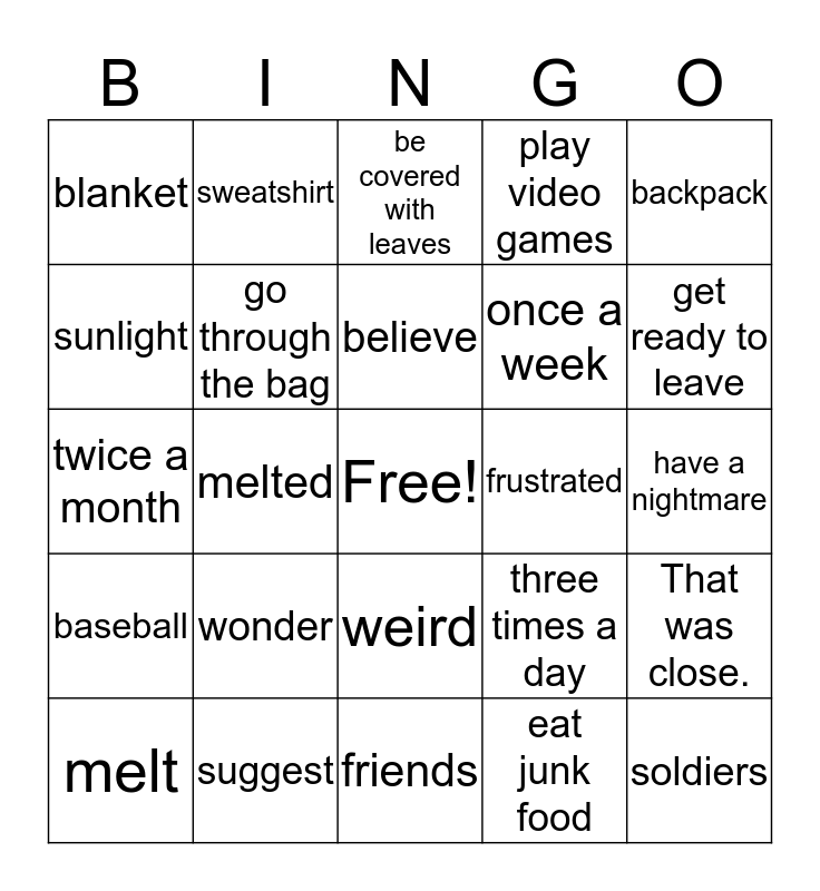 This bingo card has a free space and 24 words: wonder, suggest, believe, melt, backpack, blanket, sunlight, sweatshirt, frustrated, weird, once a week, twice a month, three times a day, That was close., go through the bag, eat junk food, have a nightmare, be covered with leaves, get ready to leave, melted, soldiers, baseball, play video games and friends.