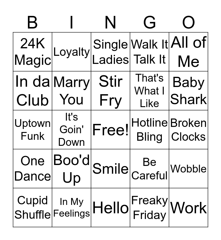 This bingo card has a free space and 24 words: Boo'd Up, In My Feelings, Stir Fry, Cupid Shuffle, All of Me, 24K Magic, In da Club, Loyalty, Hotline Bling, Smile, That's What I Like, Uptown Funk, Be Careful, Wobble, Marry You, Freaky Friday, Broken Clocks, Single Ladies, Baby Shark, It's Goin' Down, Work, One Dance, Walk It Talk It and Hello.